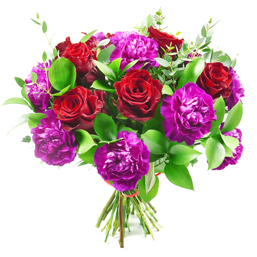 Express your deepest emotions with our timeless bouquet, featuring classic red roses intertwined with lively cerise carnations. Each flower is carefully hand-selected for unparalleled freshness, complemented by green ruscus and aromatic eucalyptus to create a unique and elegant design that symbolizes love and appreciation.